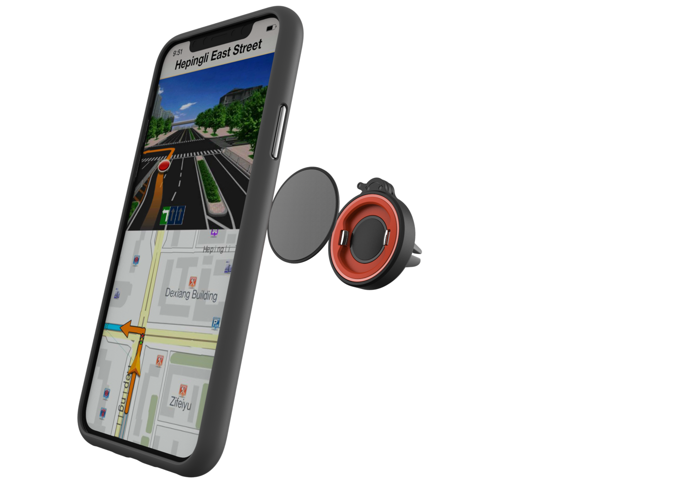 Uchwyt firmy High Five mocujemy w kratkach wywiewów czyli w miejscu które znajduje się w każdym aucie. W zastawie z uchwytem znajduje się naklejka z 1/2 uchwytu, którą przyklejasz do swojego etui. Uwaga! Z własnego doświadczenia wiemy, że warto wykorzystać w tym celu etui, które już wcześniej było używane.