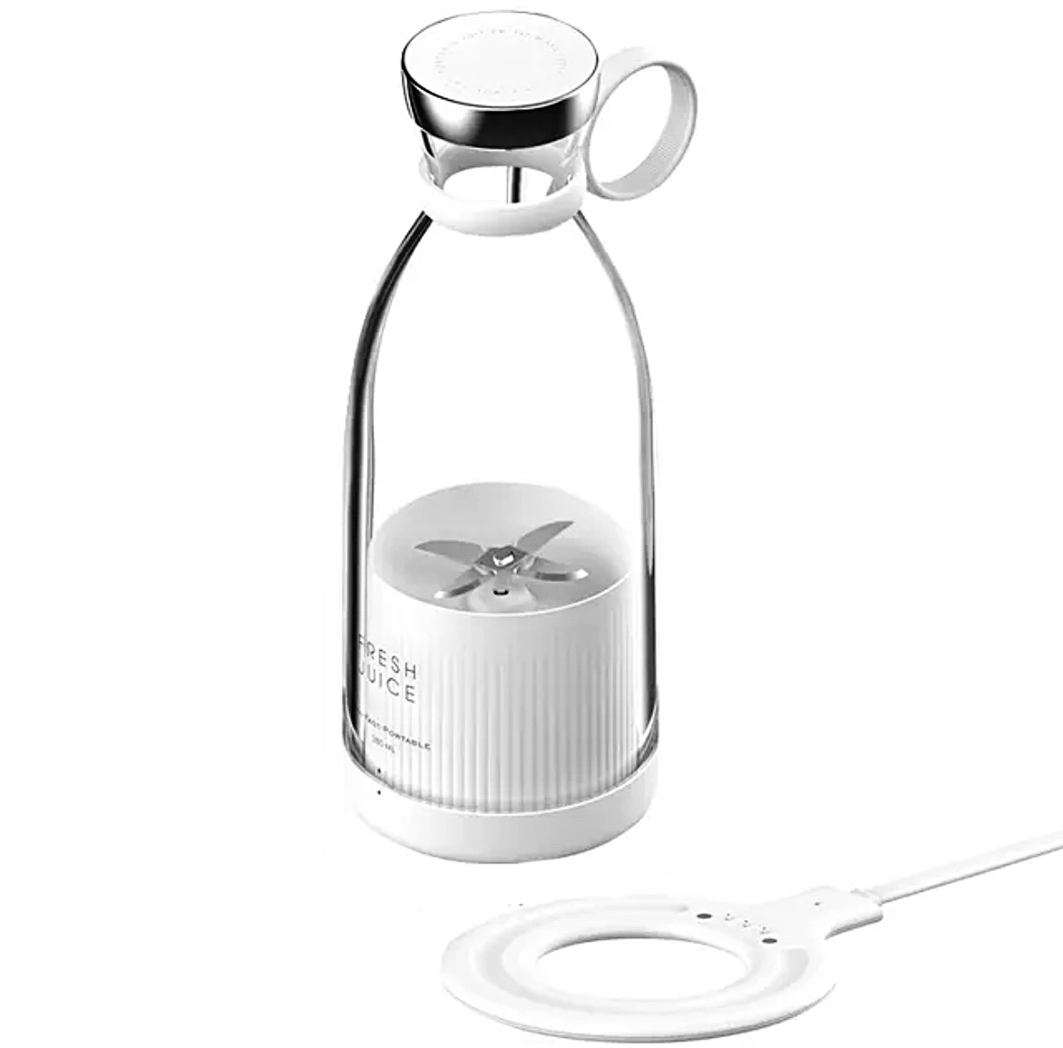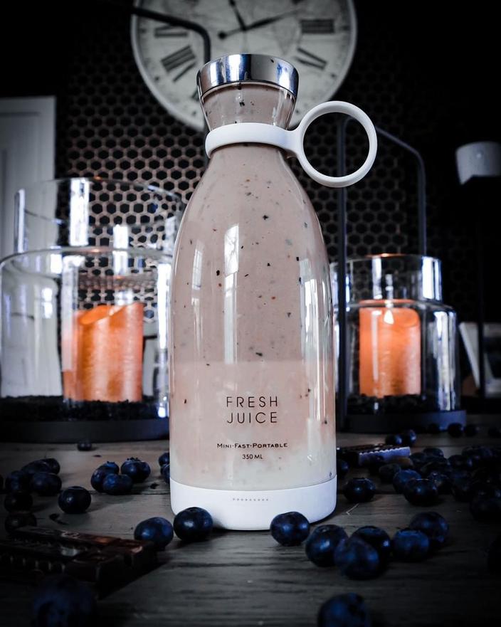 Blender w butelce Fresh Juice. Poręczna sokowirówka o pojemności 350 ml to idealny gadżet dla aktywnych lub spóźnialskich. Wyobraź sobie poranek w pracy bez śniadania lub dzień na uczelni bez kanapek. Średnia perspektywa, prawda? A teraz ta sama sytuacja z przenośnym blenderem w którym w 2 minuty zrobisz pyszną owocową/ warzywną zdrową przekąskę z łatwo dostępny produktów. Banan, jabłko, maliny, odrobina wody- którą kupisz w żabce na rogu.